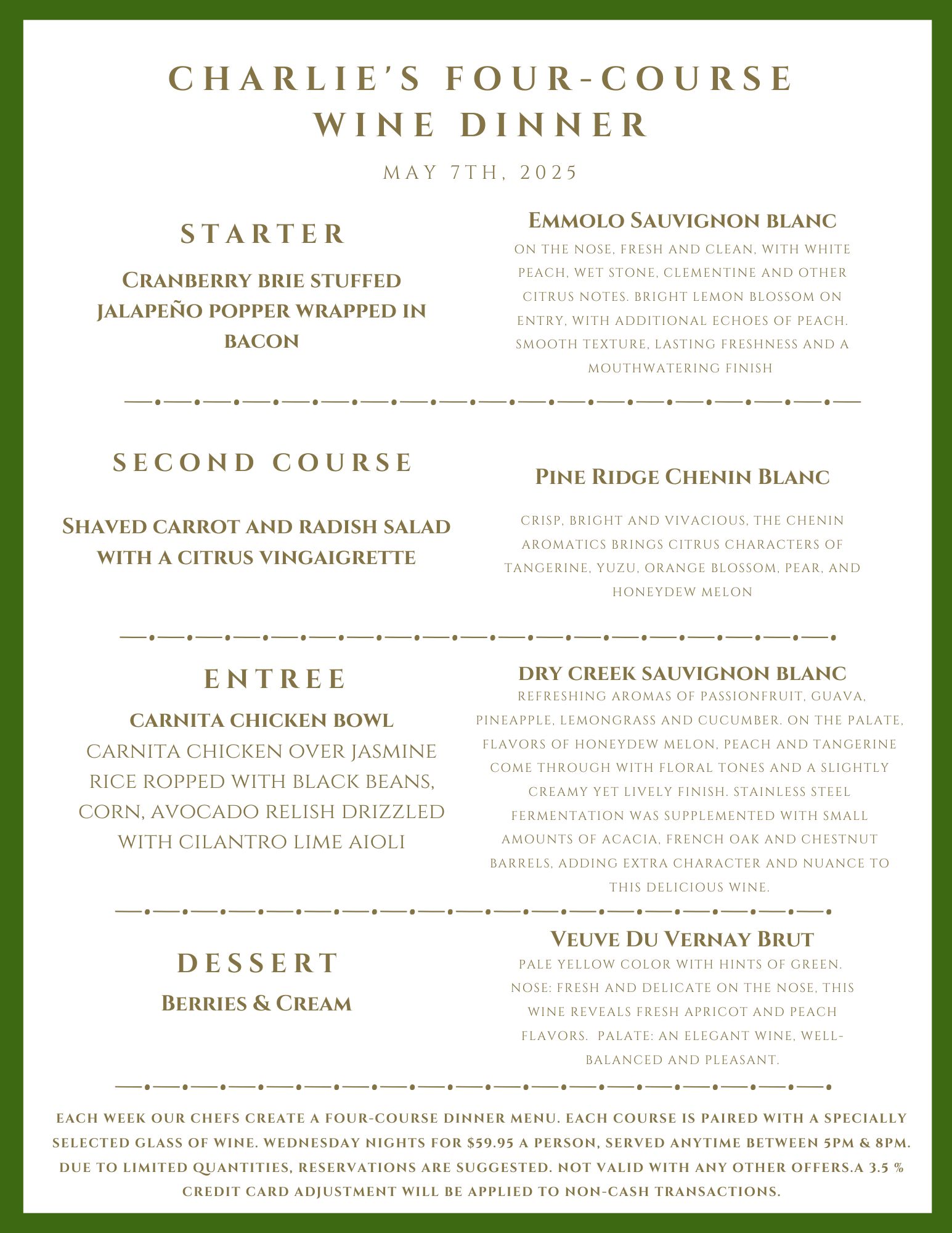 Every Wednesday, the chefs at Charlie’s Restaurant prepare a delicious four-course dinner, accompanied by wine pairings specially selected by our talented bar team, for just $59.95/person. RESERVE YOUR TABLE TODAY Note: When booking, please mention “WINE DINNER” in the request section to confirm your reservation. |