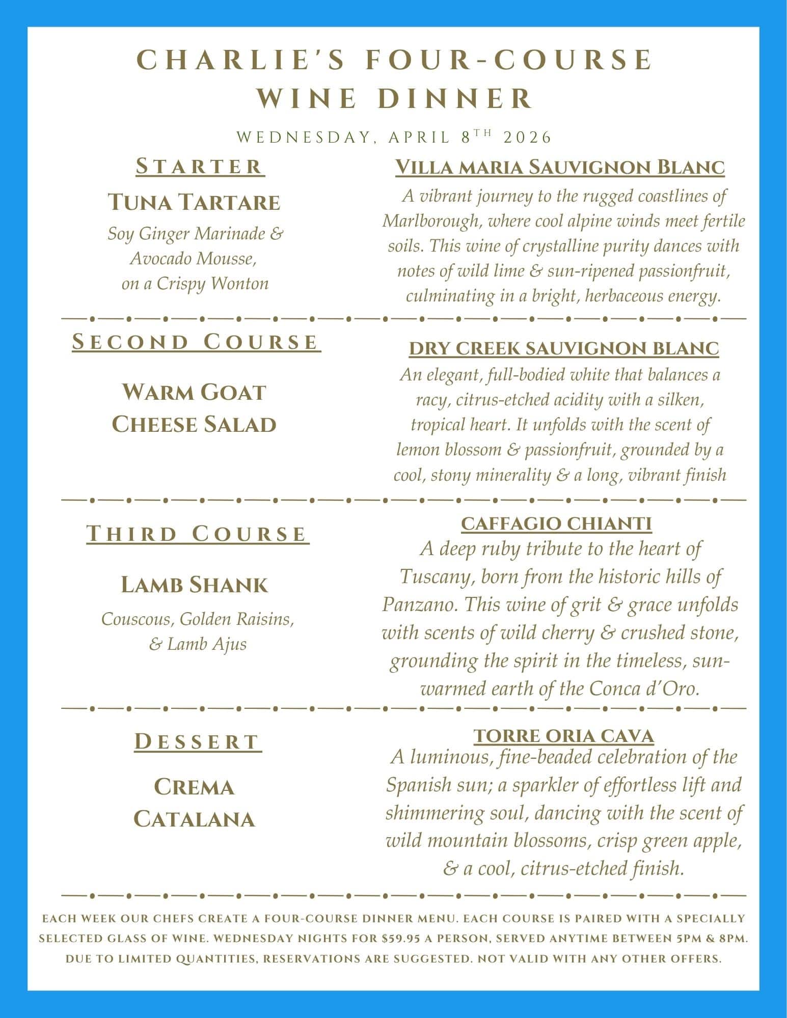 Wednesday Wine Dinner at Charlie’s Restaurant and Irish Pub