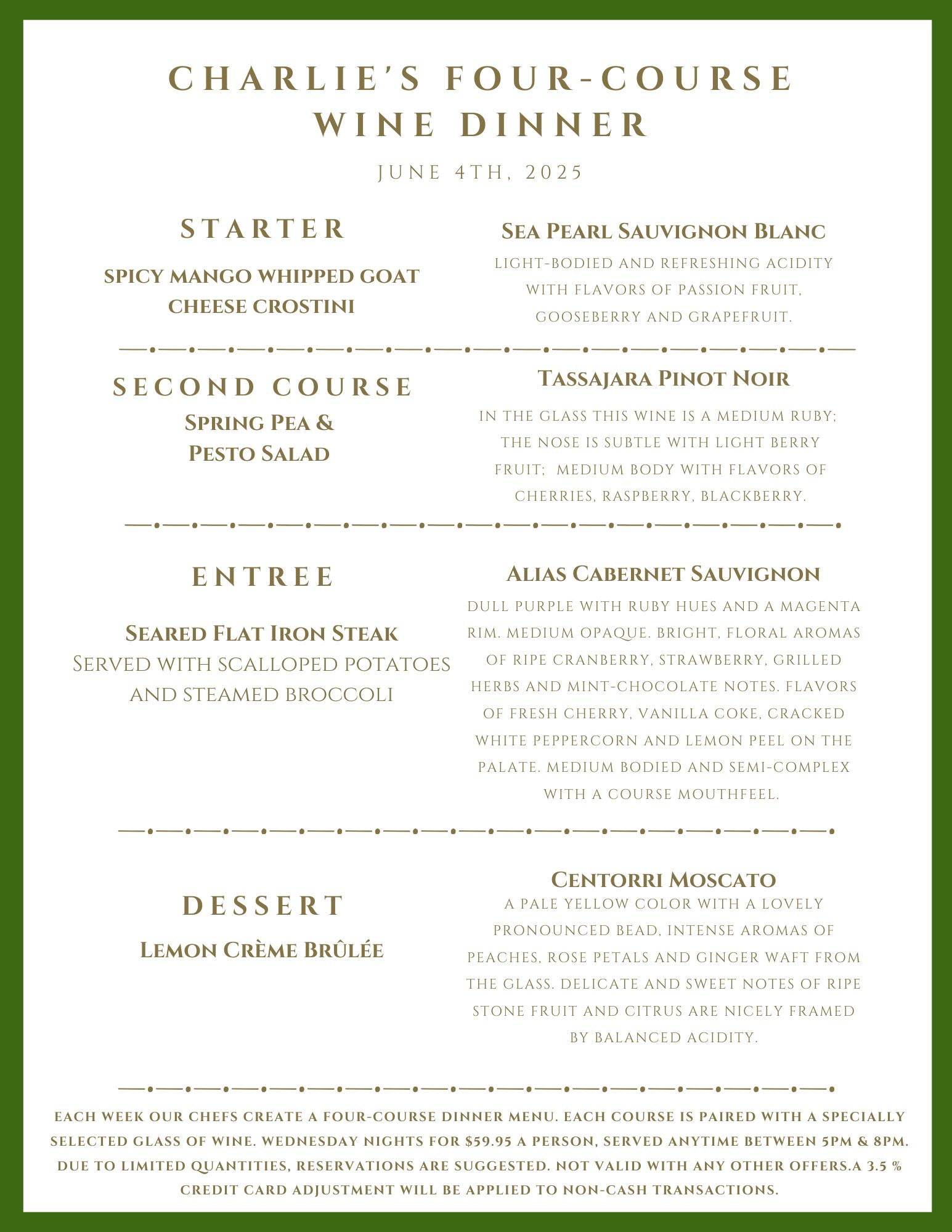 Every Wednesday, the chefs at Charlie’s Restaurant prepare a delicious four-course dinner, accompanied by wine pairings specially selected by our talented bar team, for just $59.95/person. Reservations are required.