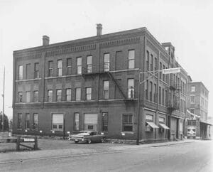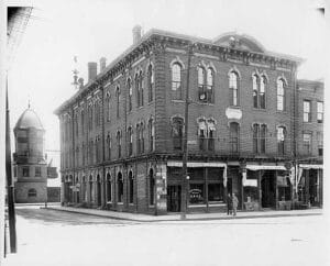 Historic Water Street block with depot tower at right (early 1900s). Credit: Water Street Inn archives.